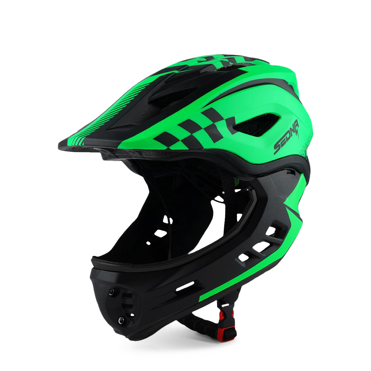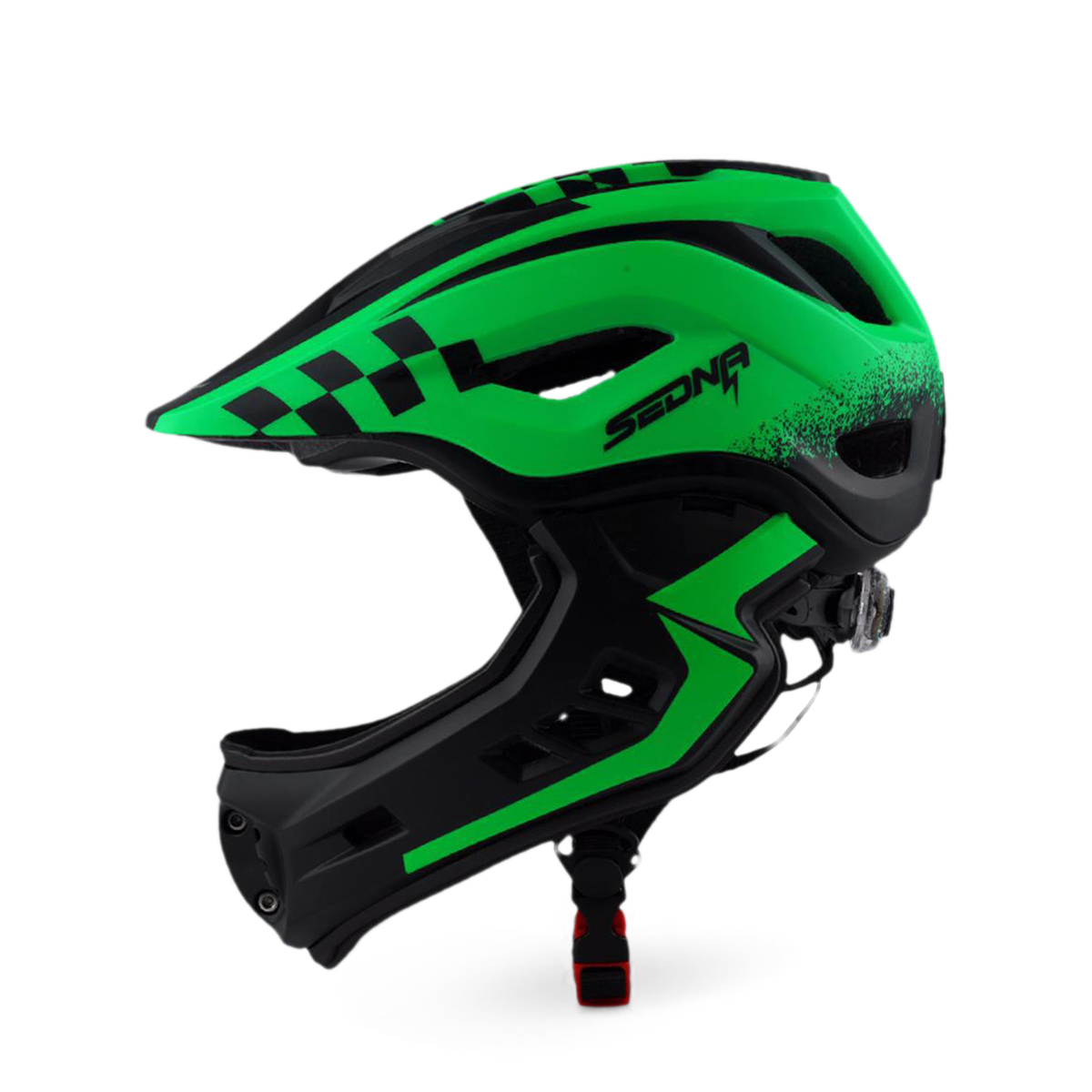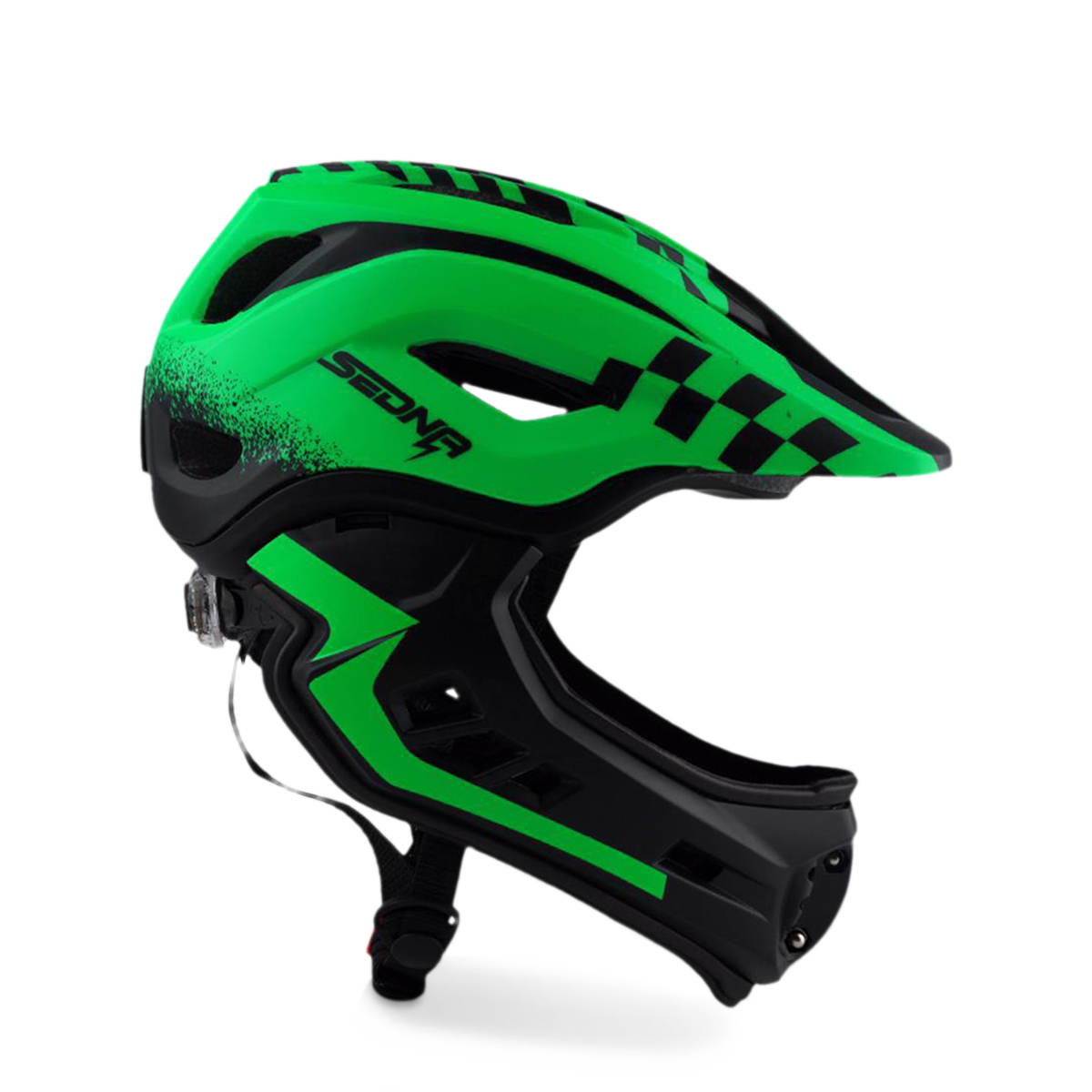 Le casque Sedna est notre nouveau casque intégral pour les enfants avec une mentonnière amovible. La mentonnière est facile à retirer et est aussi facile à réinstaller. Lorsque la mentonnière s'enlève, l'aération des joues ajoute encore plus de puissance de refroidissement lorsque votre enfant utilise son véhicule. Le gros plus de ce casque est son poids, avec seulement 410g, la tête de votre enfant sera protégée sans que ça lui fasse mal au coup.