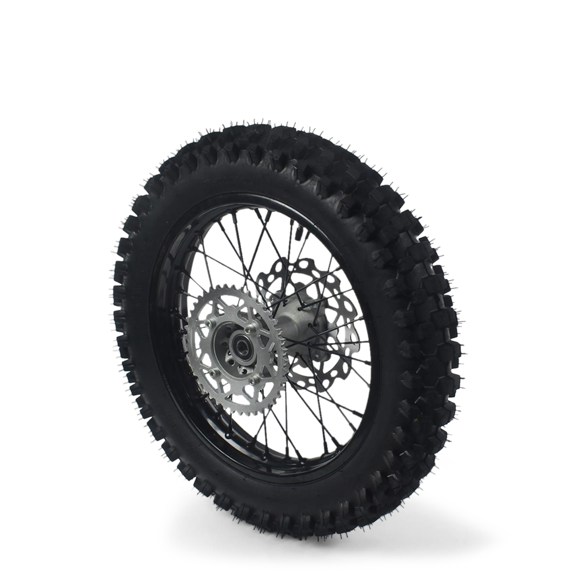 Une couronne de 41 dents en 428 ainsi qu'un disque de frein de 190mm sont montés de série sur la jante. Concernant les pneumatiques, un pneu cross Guangli 90/100-14 est en première monte. Vous aurez la possibilité de monter des Pneus cross Kenda, Pirelli, Innova Tires, Michelin, disponibles sur notre site internet.