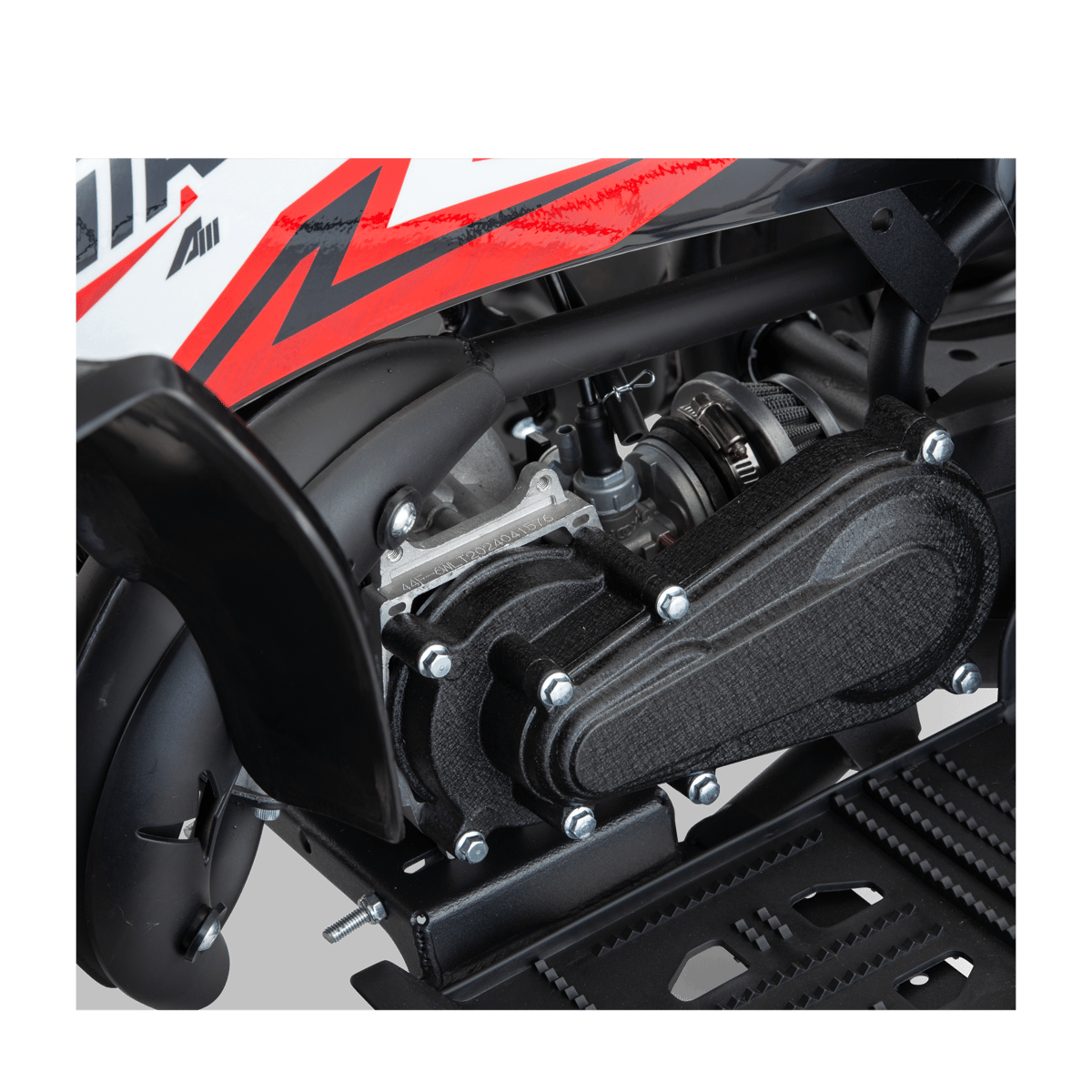 Ce pocket quad est équipé d'un moteur 2T 49cc automatique, ce pocket quad dispose du système de démarrage facile "easy-start", d'un lanceur en aluminium renforcé et d'un embrayage 2 ressorts ce qui lui confère une plus grande solidité.
