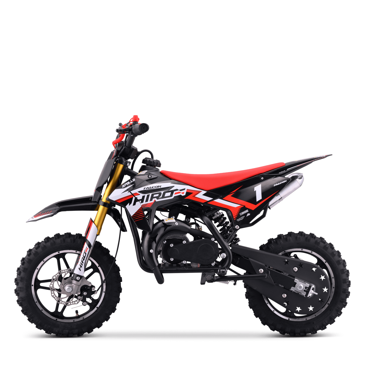 Légère, maniable et sécurisante, la Hiro Falcon 49cc est la pocket bike parfaite pour initier les enfants de 4 à 8 ans (jusqu’à 1m30) aux joies du tout-terrain. Grâce à son moteur 2 temps 49cc automatique et son limiteur de vitesse 3 positions, elle allie plaisir, apprentissage et sécurité.