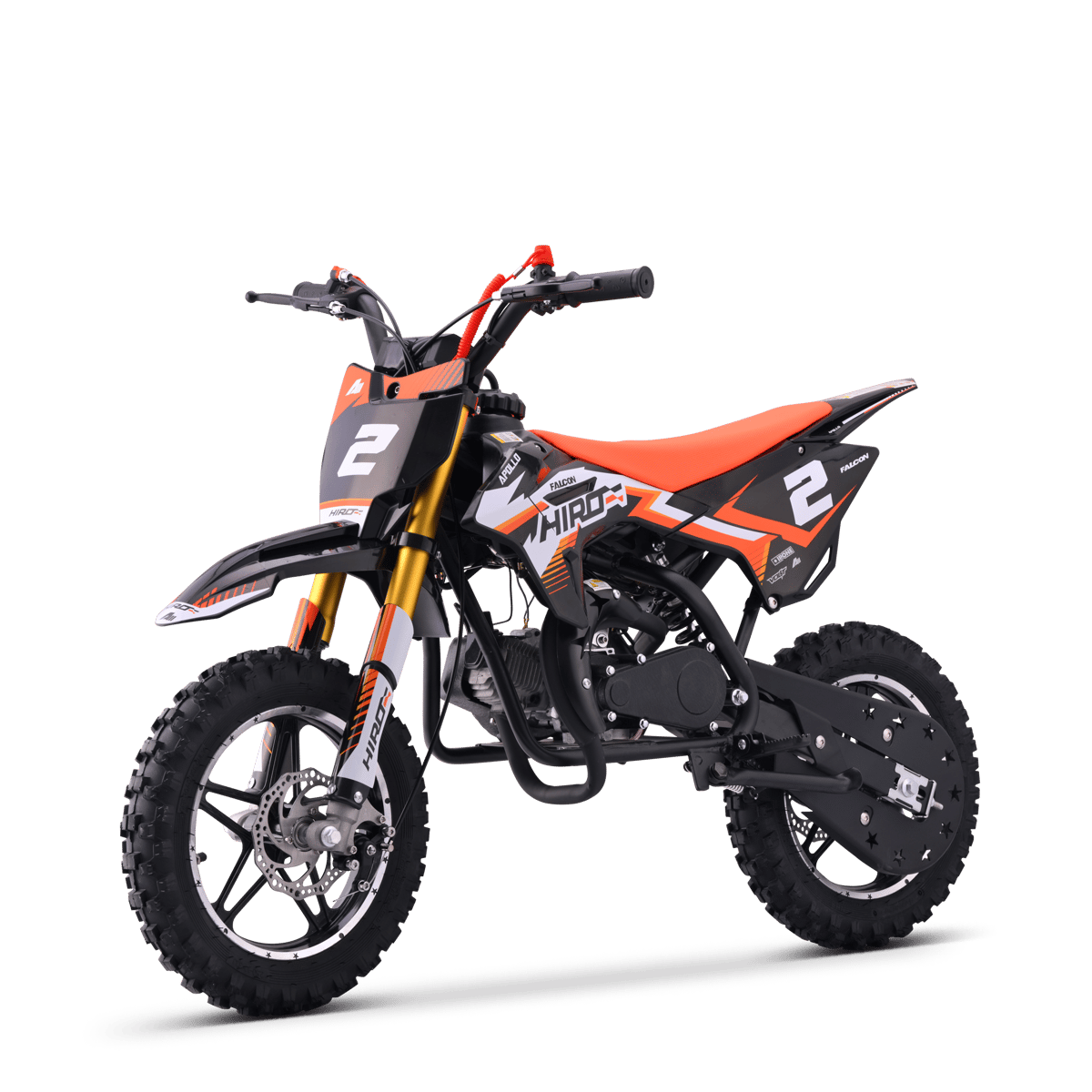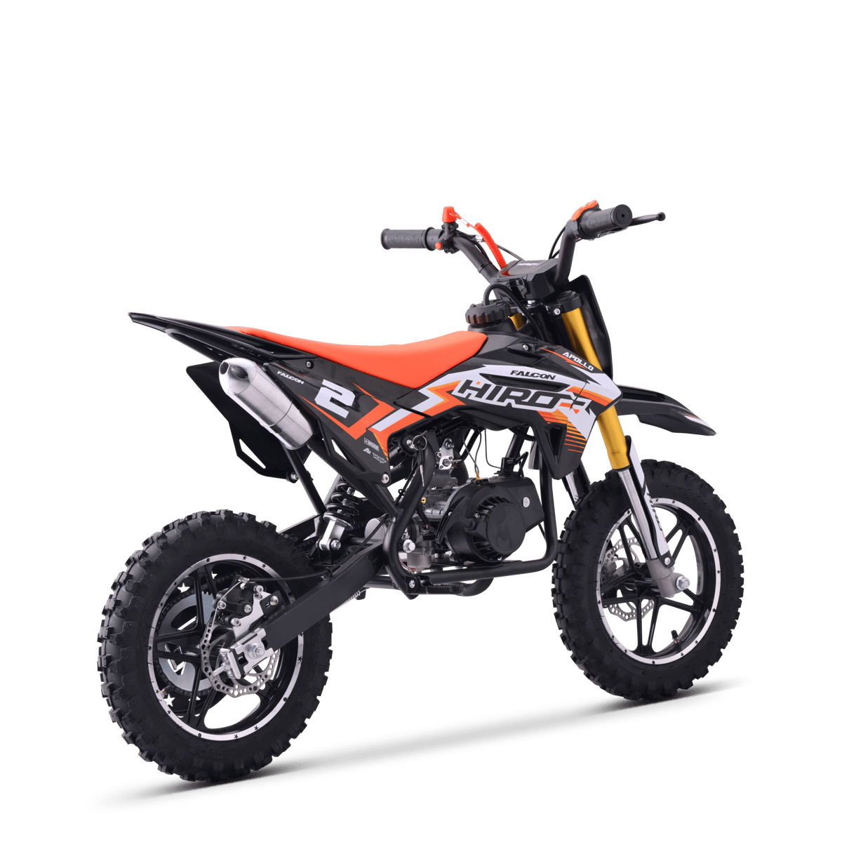 Légère, maniable et sécurisante, la Hiro Falcon 49cc est la pocket bike parfaite pour initier les enfants de 4 à 8 ans (jusqu’à 1m30) aux joies du tout-terrain. Grâce à son moteur 2 temps 49cc automatique et son limiteur de vitesse 3 positions, elle allie plaisir, apprentissage et sécurité.