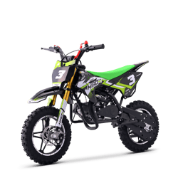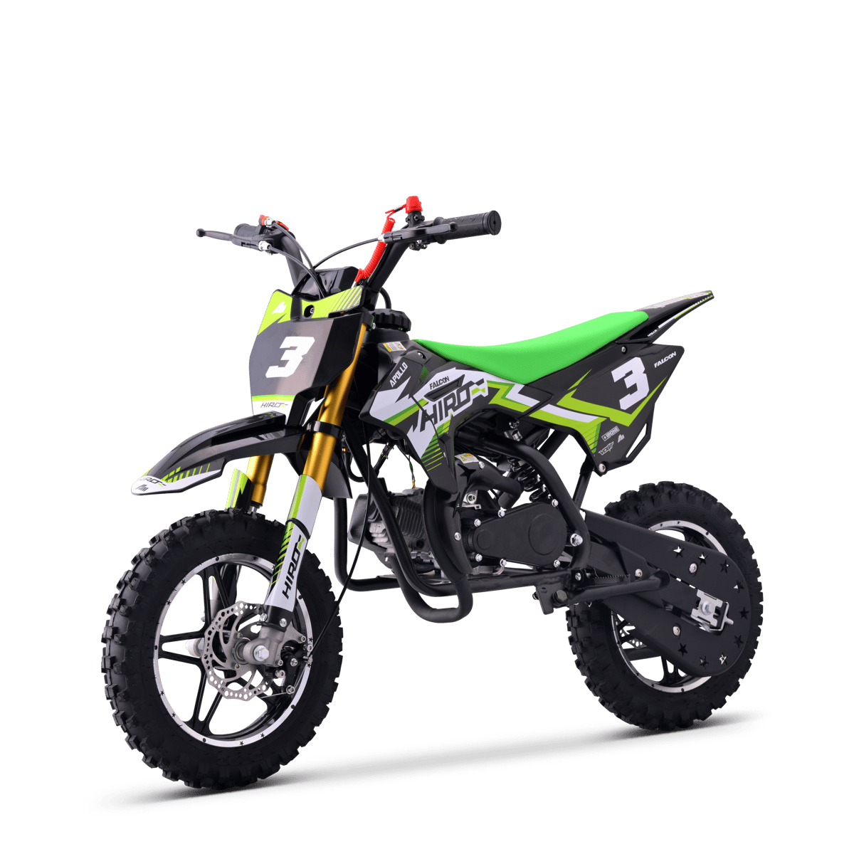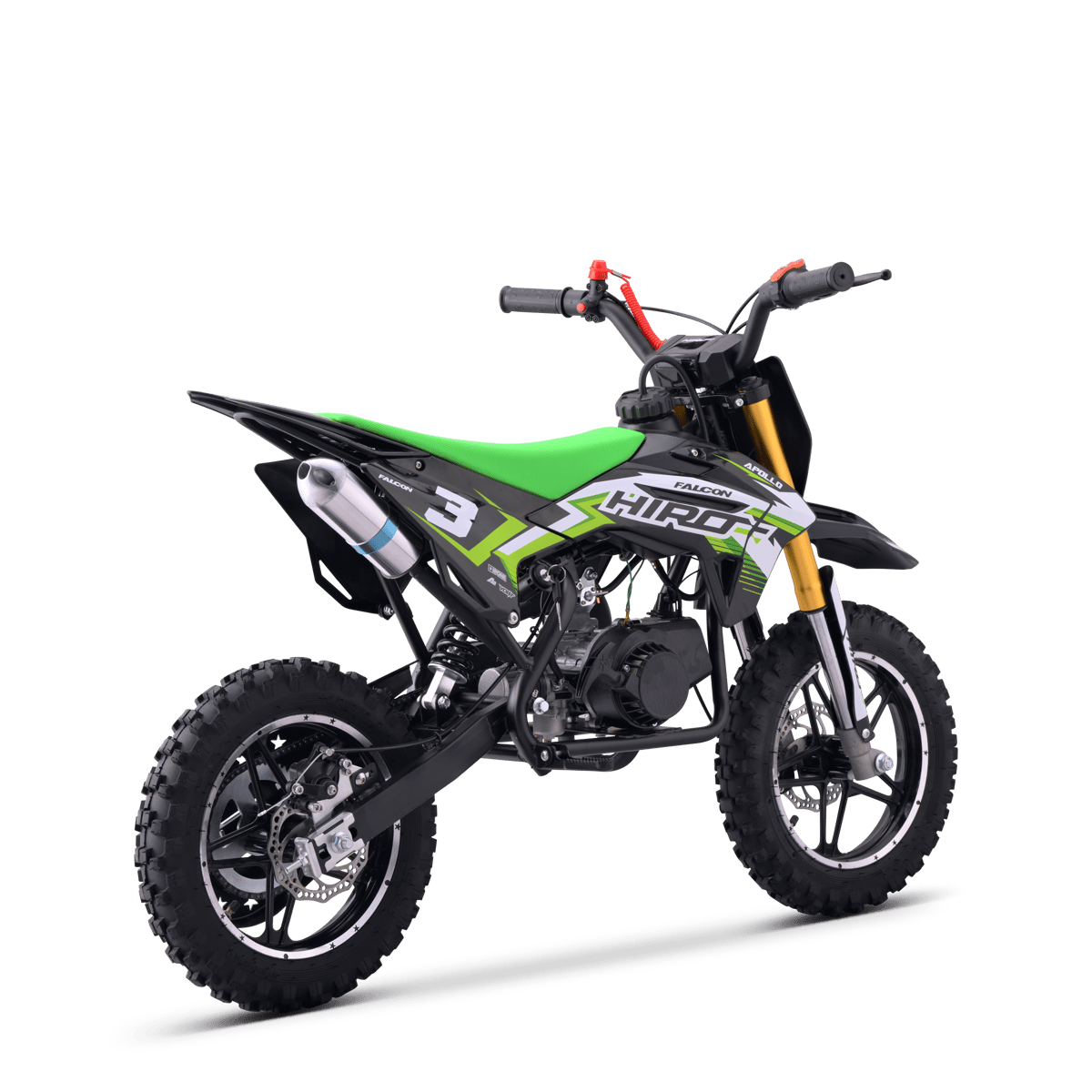 Légère, maniable et sécurisante, la Hiro Falcon 49cc est la pocket bike parfaite pour initier les enfants de 4 à 8 ans (jusqu’à 1m30) aux joies du tout-terrain. Grâce à son moteur 2 temps 49cc automatique et son limiteur de vitesse 3 positions, elle allie plaisir, apprentissage et sécurité.