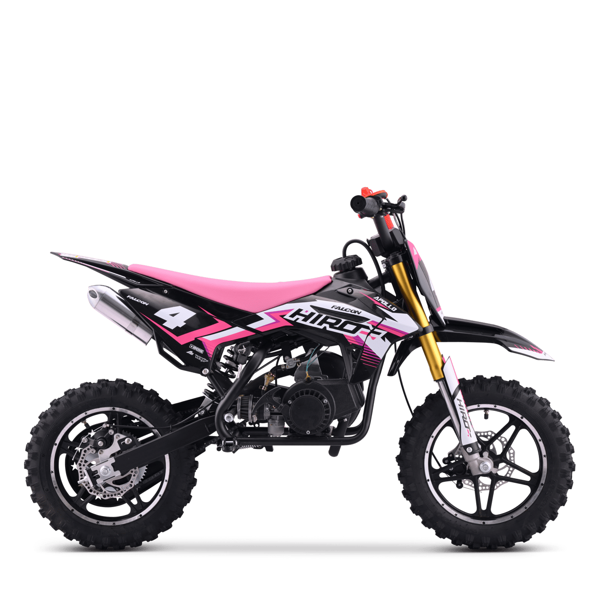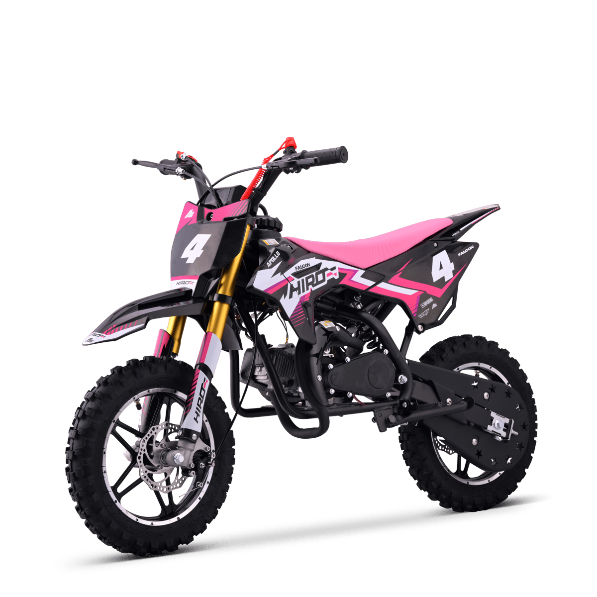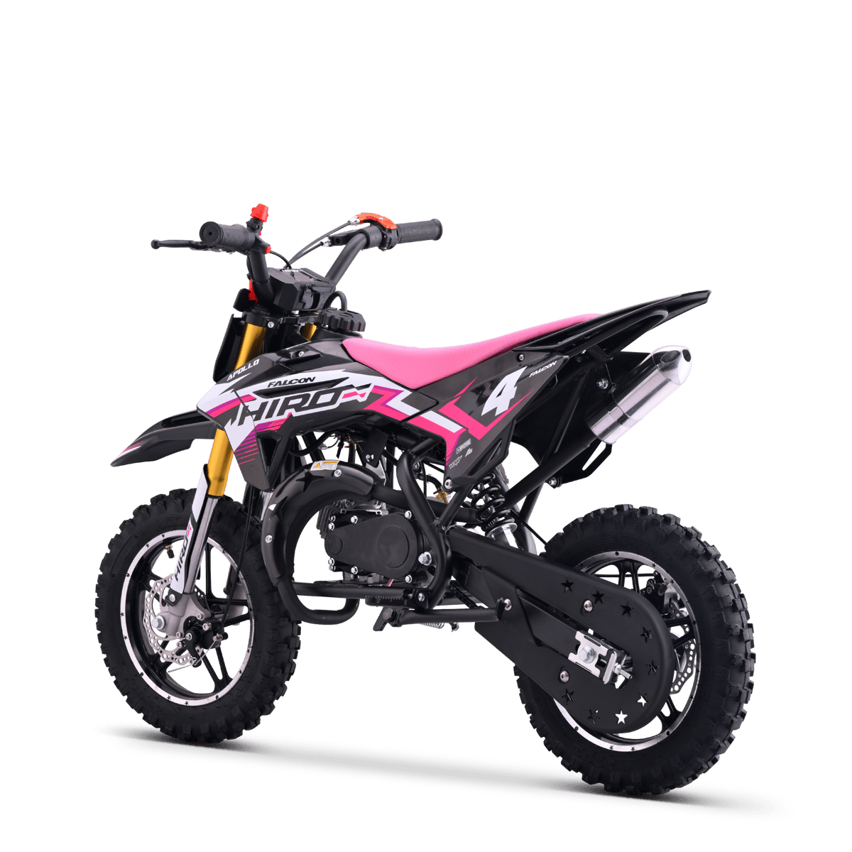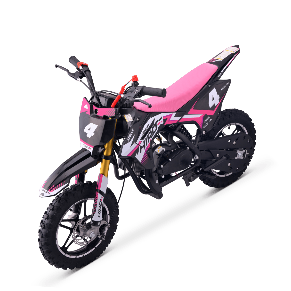 Légère, maniable et sécurisante, la Hiro Falcon 49cc est la pocket bike parfaite pour initier les enfants de 4 à 8 ans (jusqu’à 1m30) aux joies du tout-terrain. Grâce à son moteur 2 temps 49cc automatique et son limiteur de vitesse 3 positions, elle allie plaisir, apprentissage et sécurité.