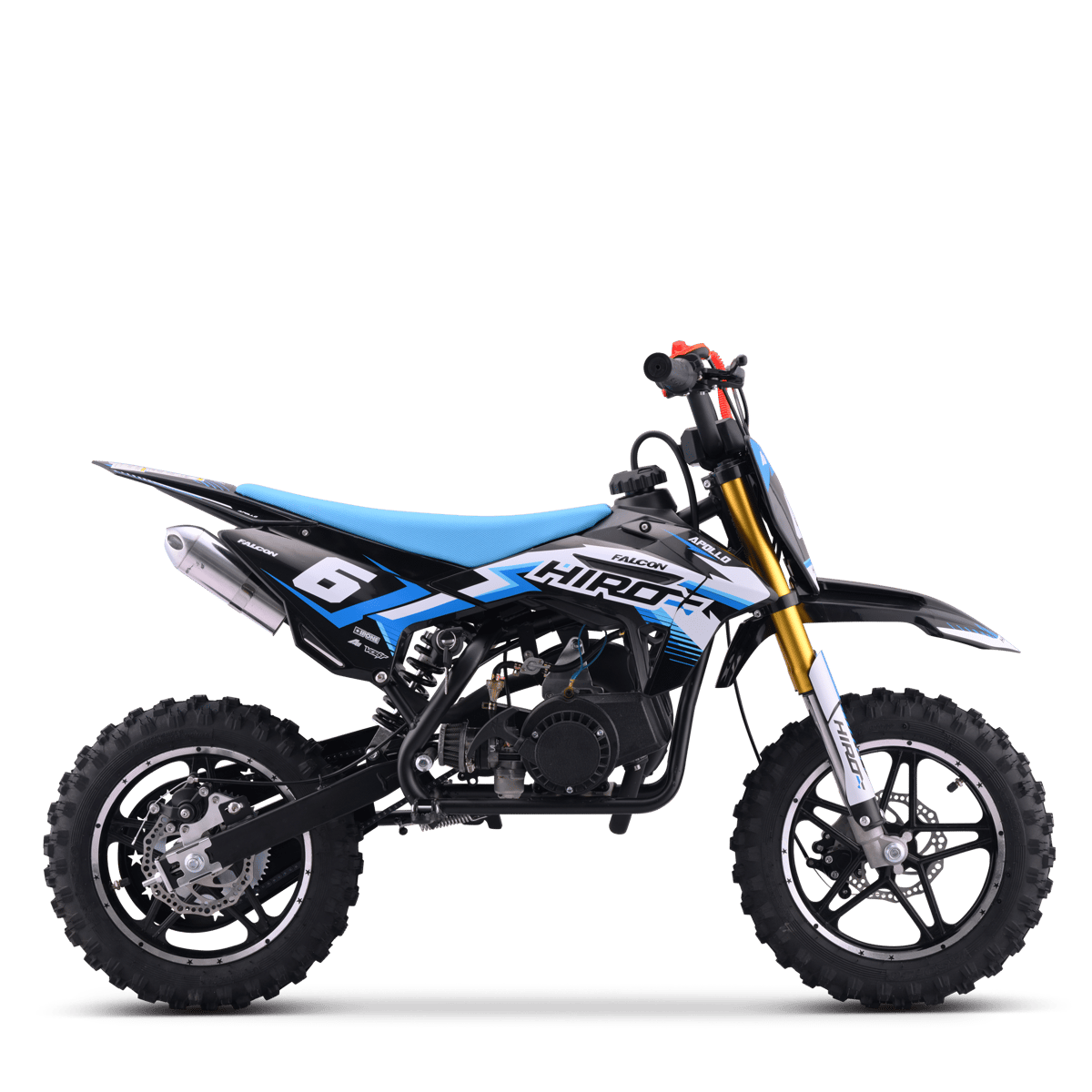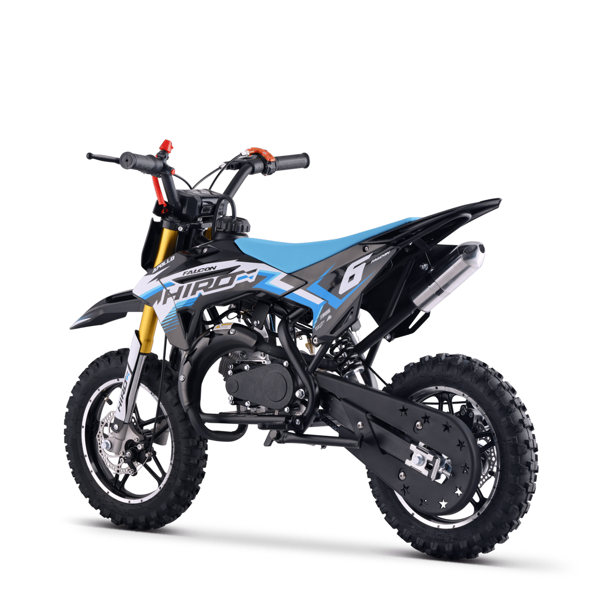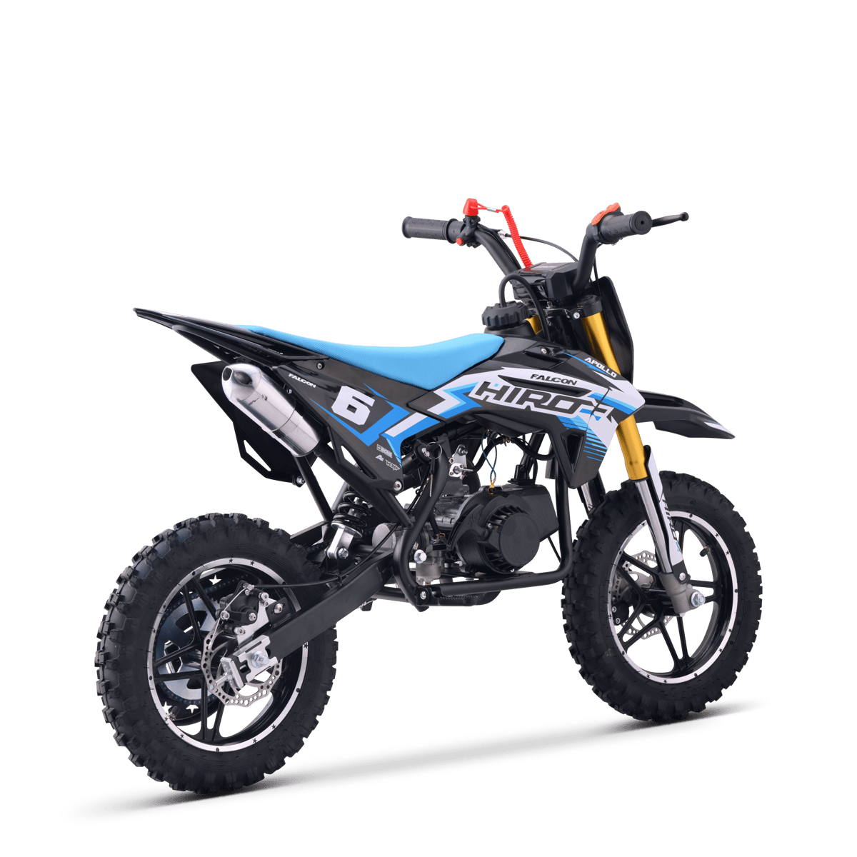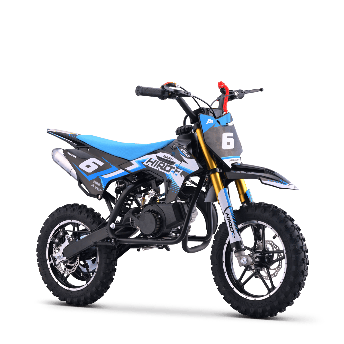 Légère, maniable et sécurisante, la Hiro Falcon 49cc est la pocket bike parfaite pour initier les enfants de 4 à 8 ans (jusqu’à 1m30) aux joies du tout-terrain. Grâce à son moteur 2 temps 49cc automatique et son limiteur de vitesse 3 positions, elle allie plaisir, apprentissage et sécurité.