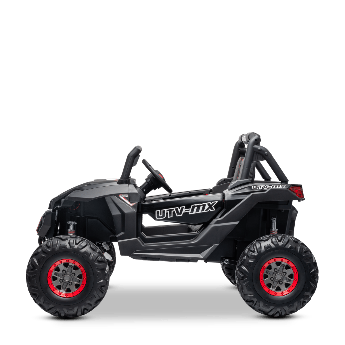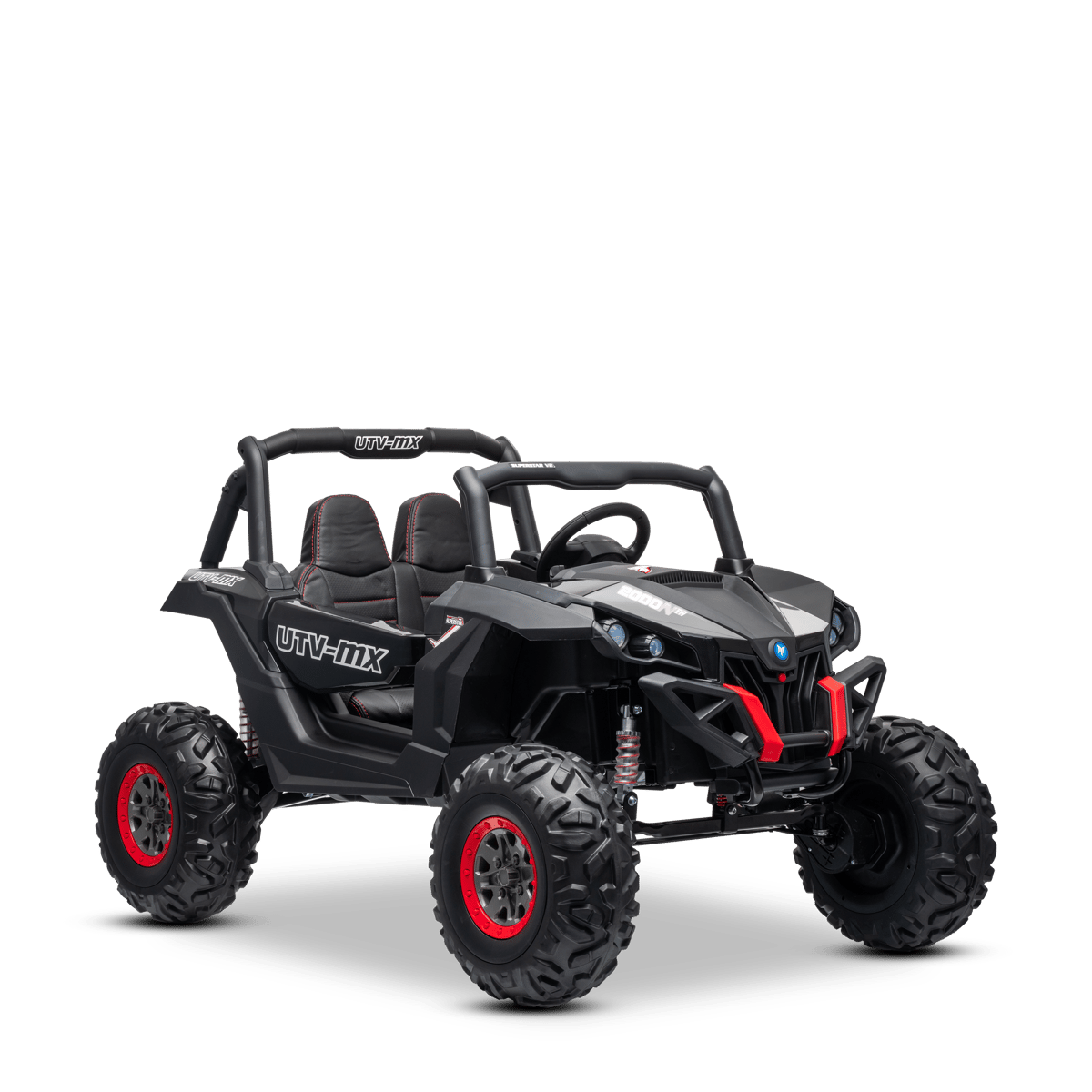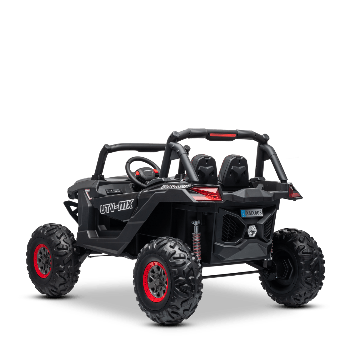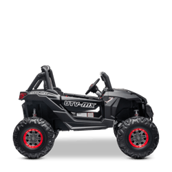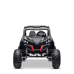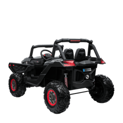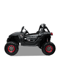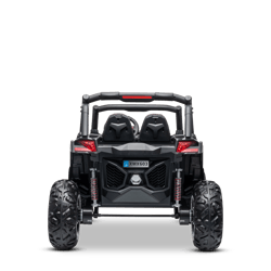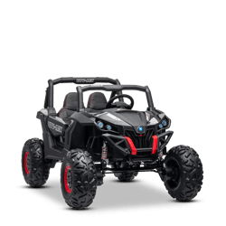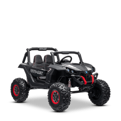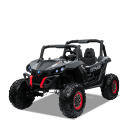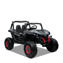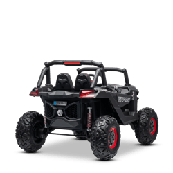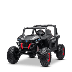 Chaque roue est équipée de 4 moteurs de 45 watts et est de type alliage avec un liseré rouge, permettant au petit pilote de se sentir comme un vrai champion. La batterie de 12 volts et 10Ah assure une autonomie d'environ 60 à 75 minutes, rarement vue sur un buggy de cette catégorie.